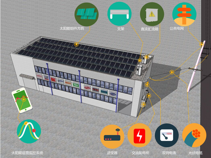 工商用分布式光伏系統(tǒng)主要由光伏組件、匯流箱、支架、逆變器及監(jiān)控系統(tǒng)組成,安裝在廠房、車棚屋頂,發(fā)電量自發(fā)自用、余電上網(wǎng)。