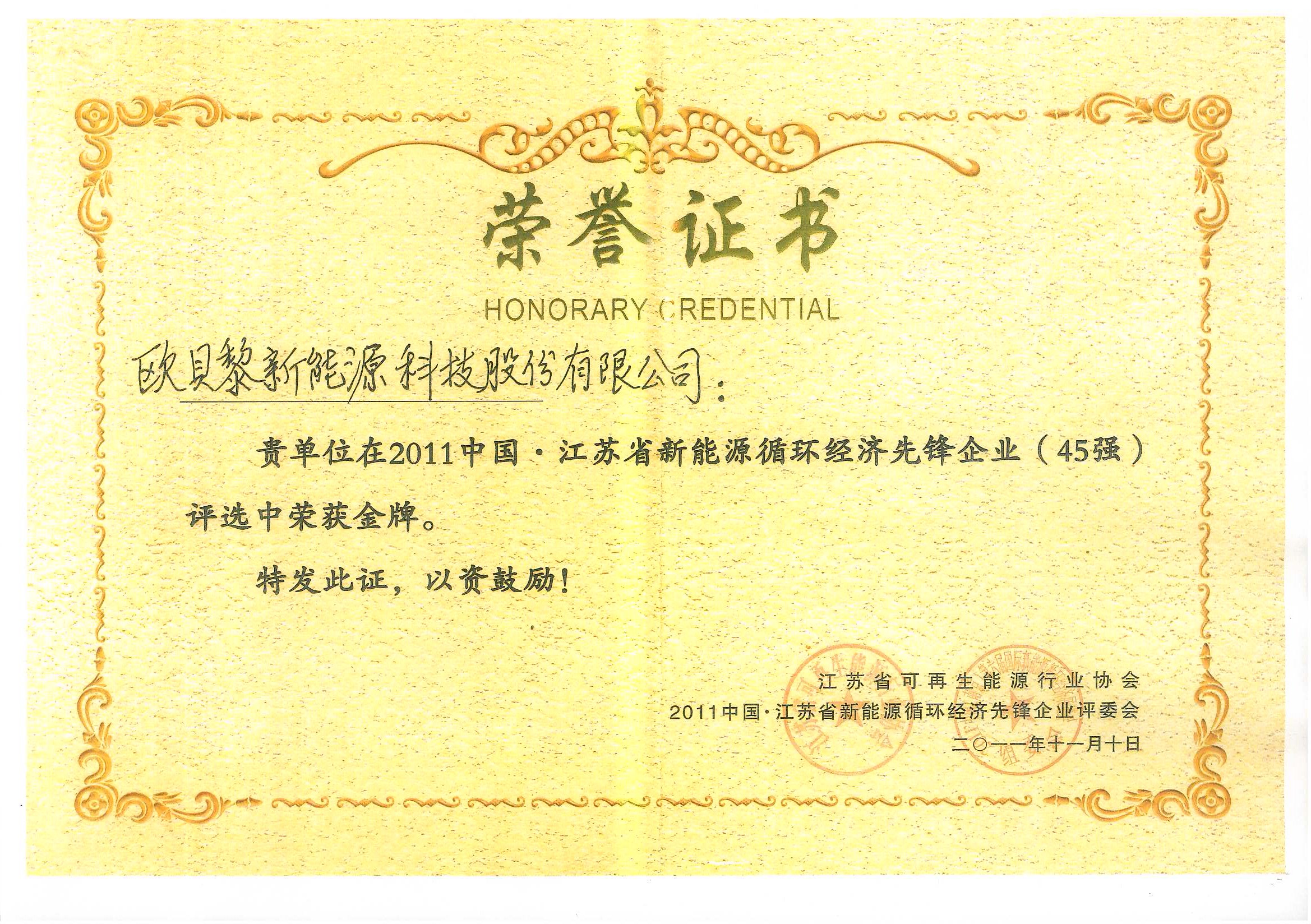 江蘇省新能源循環(huán)經(jīng)濟(jì)先鋒企業(yè)金牌